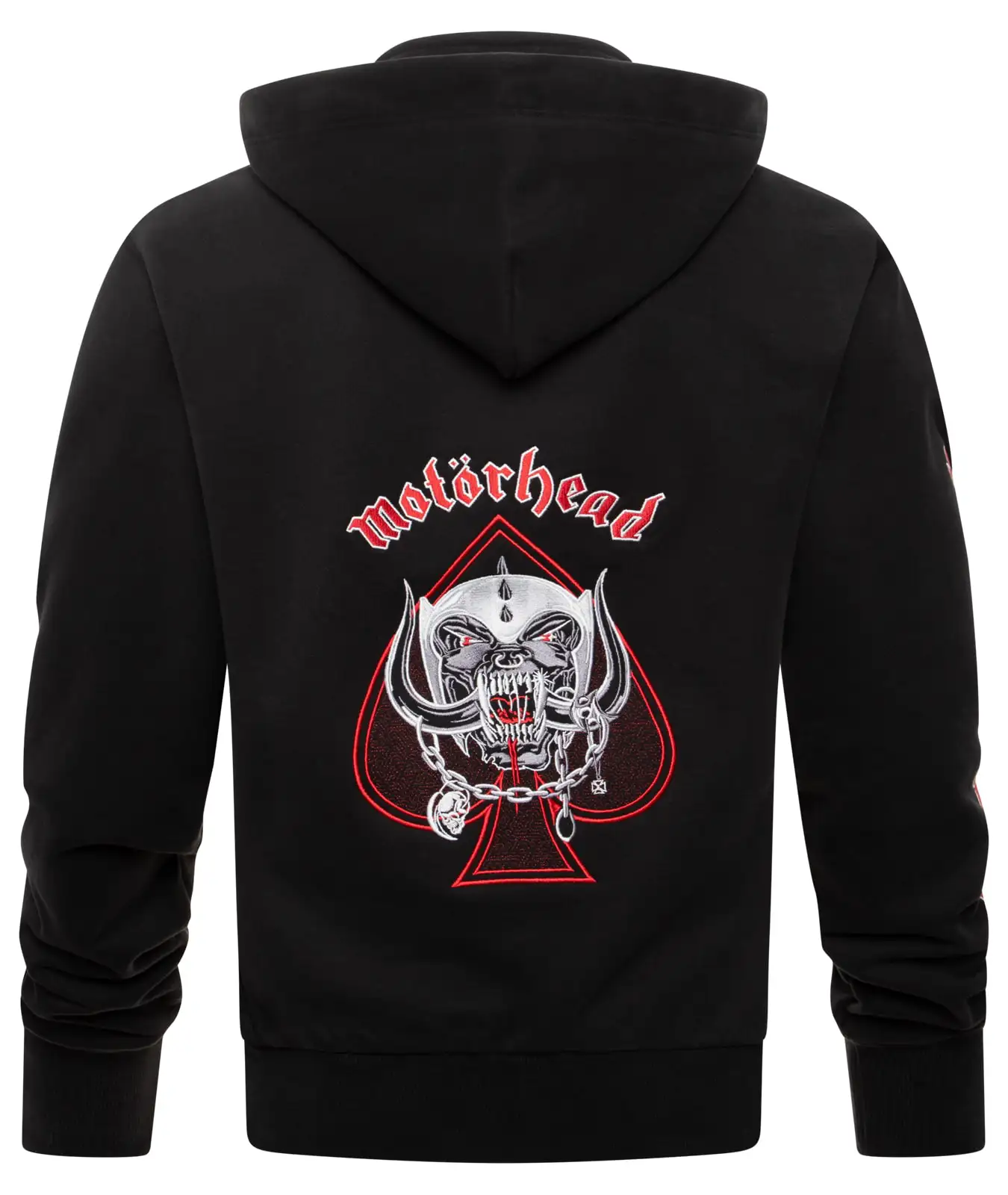 Auf dem rechten Ärmel befindet sich der Motörhead-Schriftzug, flankiert von zwei Aces of Spades-Symbolen – ein ikonisches Motiv, das den Rock’n’Roll-Spirit perfekt einfängt.