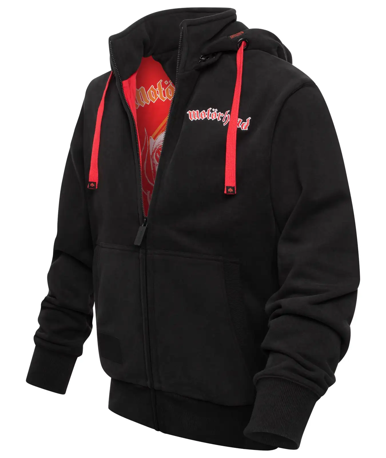 Schwarze Motörhead Kapuzenjacke mit auffälligen roten Kontrasten