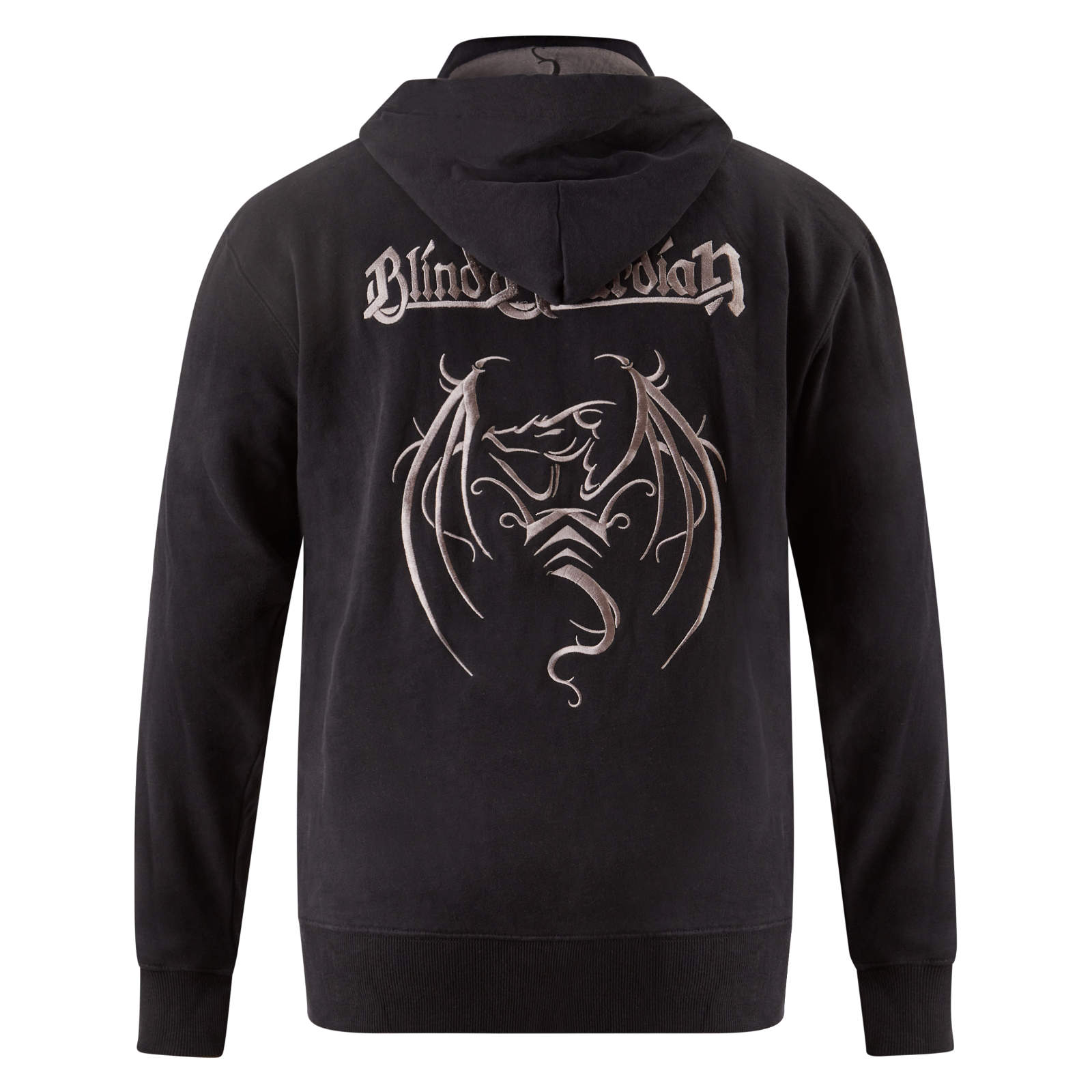 Auf der Rückseite ist das HF Logo zu sehen in Form eines aufgenähten Patches. Der Hammerfall Schriftzug auf der Kapuze ist gestickt.